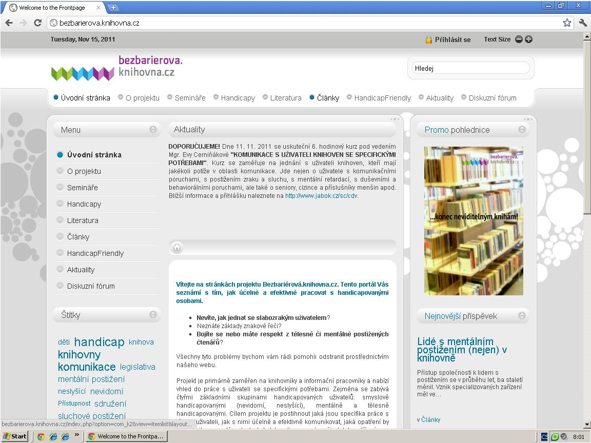 Určitou bránu k problematice i k projektu by měl tvořit portál na adrese http://bezbarierova.knihovna.cz, náhled jeho titulní strany vidíte na obrázku. Samotný web je rozdělen do několika oddílů, v nichž najdete informace o jednotlivých zdravotních handicapech, informace o proběhlých i plánovaných seminářích, články odborníků i uživatelů, kteří mají zkušenosti s touto problematikou, seznam literatury vztahující se k tématu, diskuzní fórum i aktuality z celé republiky a samozřejmě část věnovanou standardu HandicapFriendly. Portál je neustále aktualizován a jeho cílem je přinášet jasné a přehledné informace a umožnit tak knihovníkům získat na jednom místě základní orientaci v problematice zdravotně znevýhodněných.