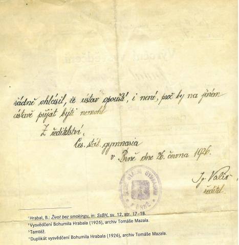 Studovat v Brně začal po smrti dědečka Tomáše Kiliána, aby babičce nebylo v židenickém domku smutno. Jenže škola budoucího spisovatele nebavila a vysvědčení plné nedostatečných tomu také odpovídalo. Na konci roku Hrabal sám prohlásil, že ze školy odchází, a zřejmě díky tomu pak mohl dostudovat a složit maturitu na státní reálce v Nymburce.