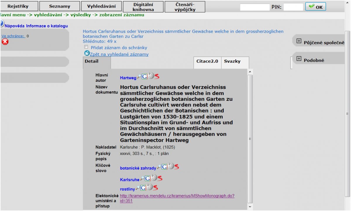 Obr. 6: Dbáme na to, aby zdigitalizované dokumenty byly dostupné uživatelům z Mendelovy univerzity i co nejširší odborné veřejnosti, proto je přístup k digitální knihovně možný několika způsoby. Pokud si uživatel v online katalogu - http://katalog.mendelu.cz/ - vyhledá podle jakéhokoliv kritéria dokument, který existuje v digitální knihovně, je na něj přímo ze záznamu link do Krameria.