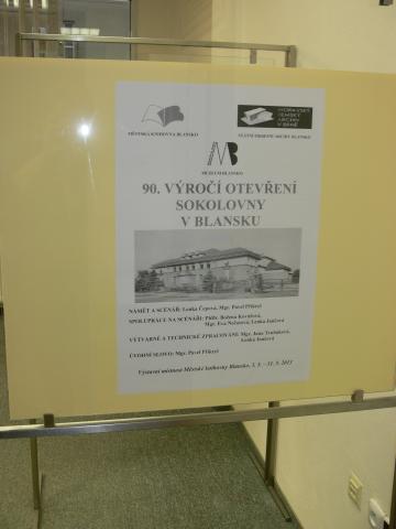 Městská knihovna Blansko zcela náhodou objevila datum 9. června 1923, kdy se sokolovna, což je ona budova, otevírala. Téma výstavy bylo na světě. Scénář zpracovali Lenka Čepová a Mgr. Pavel Přikryl. Ke spolupráci přizvali ředitelku Muzea Blansko Mgr. Evu Nečasovou a PhDr. Boženu Kovářovou, ředitelku Státního oblastního archivu Blansku. Za spolupráce tří blanenských paměťových institucí postupně vznikala zajímavá dokumentární výstava. Osnova vycházela z historické posloupnosti událostí, které stavbu předcházely: založení Sokola v Blansku, ustavení Družstva pro stavbu sokolovny, první tělocvičné oddíly, divadelní představení se svými režiséry, osobnosti spjaté s touto stavbou.