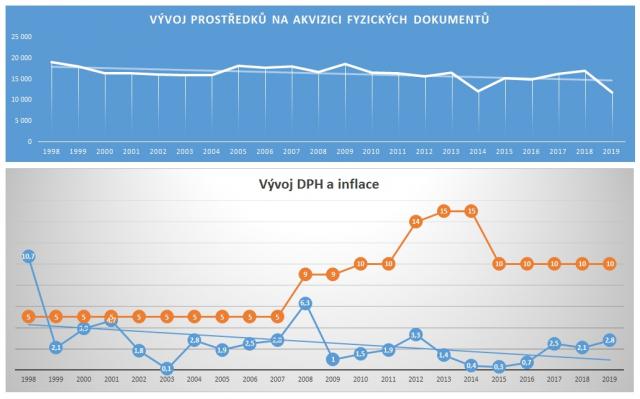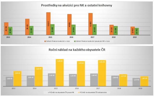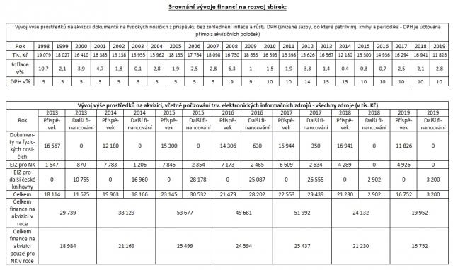 Reálná částka určená každoročně na akvizici již mnoho let neodpovídá skutečnému postavení a úloze NK v systému informačního zabezpečení vědy, výzkumu a vzdělání. NK opakovaně komunikuje tento problém se svým zřizovatelem. Dále knihovna využívá možností financování mimo vlastní příspěvek zřizovatele, ať již prostřednictvím rozvojových programů, hledáním náhradních a často velmi nestandardních způsobů akvizice. Výsledkem je však trvalé omezování rozsahu akvizice, a to nejen četností exemplářů (knihovna de facto nenakupuje ve více exemplářích ani nejžádanější tituly), ale i omezování tematického profilu knihovny. Prostředky na akvizici tradičních dokumentů jsou na úrovni cca 40 % a EIZ na úrovni 50 % rozpočtů obdobných institucí v zahraničí. Knihovna přitom dokumenty nakupuje za stejné ceny jako tyto instituce, v ČR je navíc v současné době jak u dokumentů na fyzických nosičích, tak i u EIZ jedna z nejvyšších DPH v EU. Finanční situace zásadně ovlivňuje jak kvalitu sbírek knihovny, tak samozřejmě její navazující služby. Uživatelé knihovny tuto skutečnost vnímají velmi negativně a poukazují na fakt, že dostupnost k odborné literatuře se paradoxně v otevřené společnosti oproti předchozím obdobím trvale zhoršuje. Tento fakt pociťují zejména studenti a vědečtí pracovníci specializovaných, tzv. malých oborů z oblasti společenských věd, které jsou více závislé na dokumentech v papírové podobě a měřitelná aktuálnost a užitnost dokumentů podle poločasu rozpadu informací je nesrovnatelně delší než u dynamických oborů např. aplikovaných přírodních věd. To v důsledku znamená nejen aktuální nedostatečnost, ale vytváření velkého dluhu pro příští generace. K tomu je třeba ještě podotknout, že ČR je mnohem více závislá na zahraniční odborné produkci než velké země, protože její malý trh není atraktivní pro vydávání specializovanější odborné literatury v češtině.