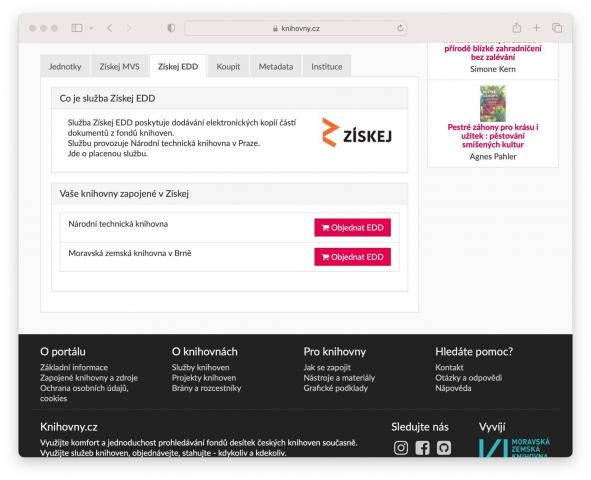 Elektronického dodávání dokumentů ZÍSKEJ v Centrálním portálu knihoven Knihovny.cz