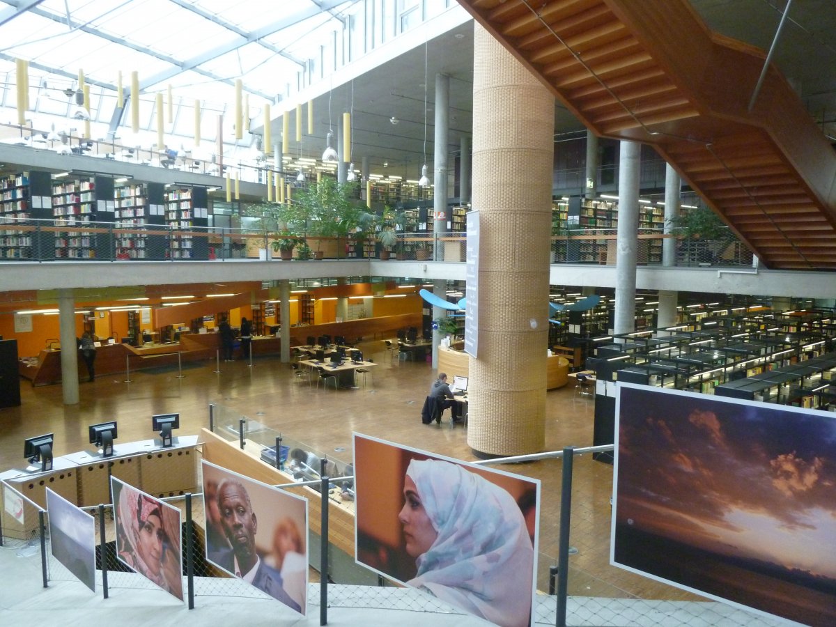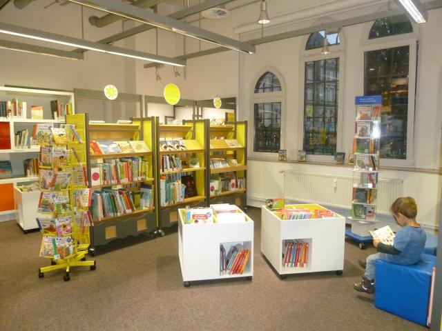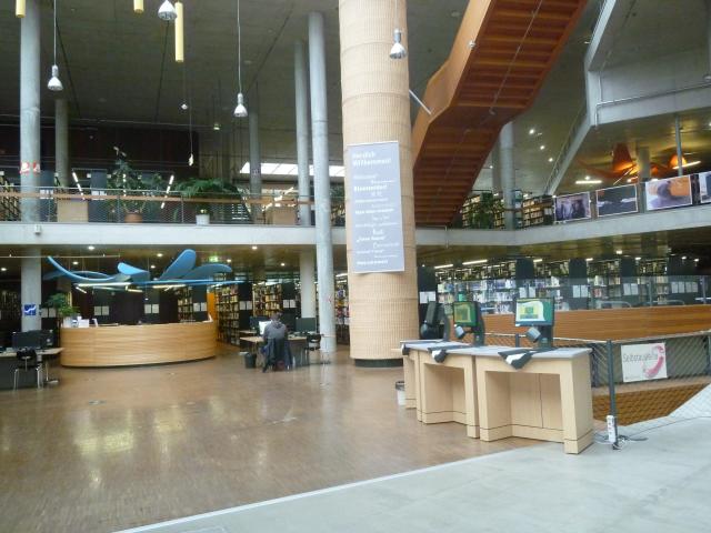 Veřejná knihovna, byla založena z r. 1899, k 111. výročí knihovny 11. 11. 2011 znovuotevřeli centrální knihovnu v budově původní pošty. Knihovna plní regionální funkci, obhospodařují stejným systémem přes své pověřené knihovny okolní knihovny v obcích. Sami k nim distribuují výměnné fondy. Mají 14 poboček knihovny, 2 bibliobusy; celkem 387 plných úvazků knihovníků (z toho v ústřední knihovně je 71 plných úvazků, z původních 100 úvazků před pěti lety pociťují jako zhoršení). Zejména při konání různých akcí využívají práce celkem 475 dobrovolníků! Dokumentový fond se skládá z 50 % tištěných knih a 50 % AV médií, což je největší objem z knihoven v Německu, hudebniny půjčují meziknihovní službou do ostatních knihoven. Ročně nakupují 468 000 titulů ve 28 jazycích. Fond má celkem 3,7 mil. svazků. Počet návštěv(níků) / rok: 1 030 000. Knihovna nabízí autorská čtení, workshopy, představení. V neděli se podle zákoníku práce v Německu nesmí půjčovat, mohou pouze akademické, veřejné knihovny ne. Knihovníci jsou pyšni na velkokapacitní automatickou třídičku fondu.