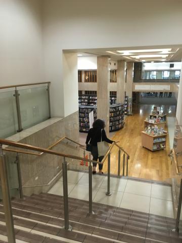 Budova zvenku byla mnou opět nenafotitelná – buď jsem si ji fotila z příliš velké dálky, nebo se mi nevešla do hledáčku mobilního telefonu – naštěstí je dominantou města a snadno si její průčelí dohledáte – třebas na FB stránkách knihovny. Vnitřní prostory jsou směsí starého a citlivě zachovaného interiéru, nových přístaveb, vestaveb a propojení z 80. let, kdy knihovnu rozšiřovali, a změn z roku 2005, kdy se upravovaly vnitřní prostory mimo jiné pro bezbariérový přístup. Centrální hala na mě při vstupu zapůsobila jako terminál rušného nádraží, tedy hodně přeplněně a nepřehledně. Těsně vedle sebe tu najdete kavárnu, infopult, vyhledávací terminály, denní tisk, mix sedacího nábytku nejrůznějších tvarů a stylů, tematickou výstavu měsíce, rozcestník, několik schodišť a výtahů a odbočujících chodeb do dalších prostor. Když si ale s časovým odstupem prohlížím své fotky, žasnu, kolik zajímavých detailů mi kvůli tomu prvnímu pocitu v paměti zapadlo. Například chytře umístěný selfcheck k půjčování a vracení knih, hnízdo relaxačních křesel – ušáků, „povídací domeček“, restaurovaný dřevěný pult na čtení novin atd. Naštěstí jsme se do tohoto prostoru vrátili na konci exkurze a od jiného vstupu. Změnila jsem názor a udělala další foto, na kterém je vidět mezonetové uspořádání prostor a doslova úžasná studovna s volným výběrem beletrie a společenskovědních publikací.