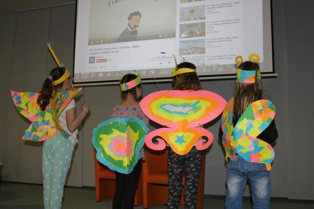 Noc s Andersenem nám přičarovala motýlí křídla, stejně jako Kubovi z autorčiny knihy Kuba nechce spát. Jejich pestrost zajistila „bojovka“, při které družstva dětí sesbírala desítky kousků barevných papírků rozházených po knihovně. Pak už stačil jen tvrdý papír jako základ křídel, provázek zajišťují jejich pohyblivost, nůžky, lepidlo a volnost tvořit. Za půl hodiny vzlétlo do prostoru několik mladých motýlů s nádhernými křídly, sosáčky i tykadly. Příhoda z knihy Johana s dlouhýma nohama nás inspirovala ke stezce odvahy a Tramvaj plná strašidel přímo pojmenovala naše soutěžní družstva. Křižíkovci, Dvořákovci, Smetanovci, Němcovci a Čapkovci. Zatímco v knize vystupují duchové těchto slavných osobností, u nás v knihovně jsme zhlédli kus jejich života. Do scénky ztvárněný životopis se dětem opravdu povedl.