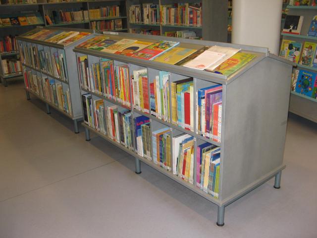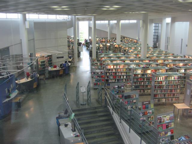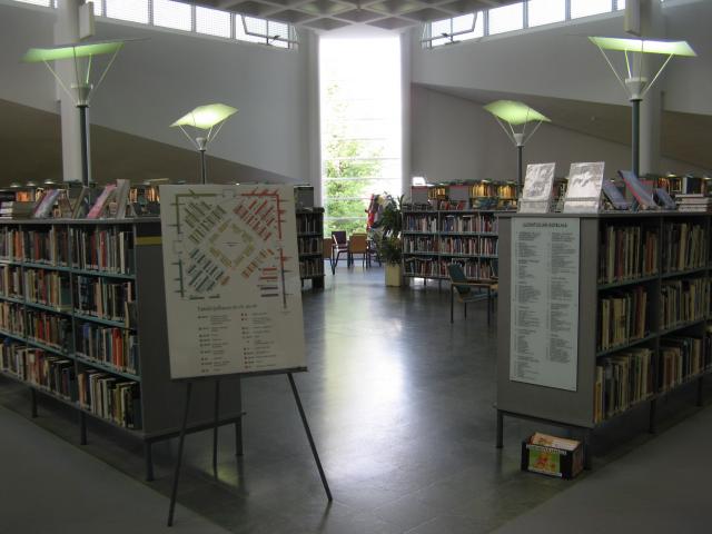 Za absenčními výpůjčkami je nutné vystoupat do prvního patra knihovny, kde je umístěno oddělení pro dospělé a dětské oddělení. Přímo u vchodu do oddělení pro dospělé návštěvníky zaujmou samoobslužné automaty pro půjčování a vracení publikací. Velké oblibě se těší nejen u knihovníků, ale stále více i u čtenářů. Těm, kteří informační technologie nepreferují, je určen tradiční výpůjční pult, jehož výška je dokonce elektronicky nastavitelná. Dvě třetiny fondu jsou uloženy ve volném výběru (beletrie, odborná literatura), méně využívané dokumenty ve skladech s kompaktními regály. Knihy ze skladu jsou uživatelům vyhledány okamžitě po zadání požadavku na výpůjčku. Kromě knih je uživatelům k dispozici také kolekce filmů na DVD. Z českých titulů jsme na regále objevili pouze oscarového Kolju. Dispozice oddělení pro dospělé má představovat pomyslné město. Regály tvoří bloky „domů“ a uprostřed zástavby je malé náměstí – prostor pro pořádání menších akcí, čtenářských besed nebo pohodlné individuální čtení. Rozmístění fondu na regálech mají uživatelé graficky znázorněno a barevně rozlišeno tak, aby se v něm pohodlně vyznali.