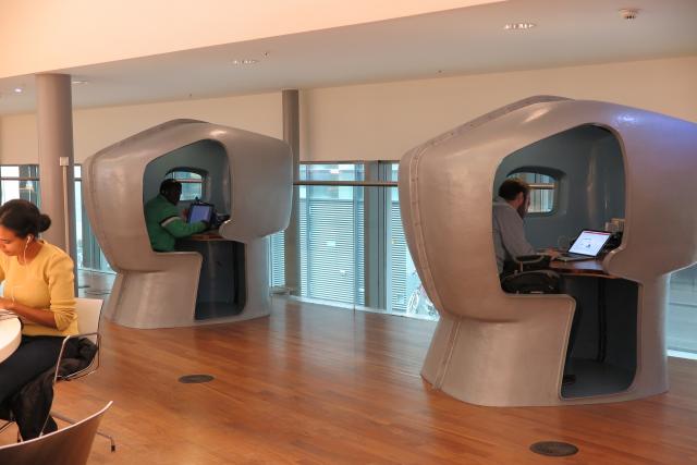 Budova z r. 1997 je dílem známé architektky Frnacine Houben (např. Knihovna v Birminghamu, nyní řeší knihovnu v New York). Plocha má 15 000 m². Je zde velká sbírka e-knih, kromě toho 45 km fondu tištěných knih, v současnosti již nakupují pouze e-knihy. V letech 2007-2010 se ukázala potřeba uzpůsobit prostor knihovny jiným potřebám, byla nutná proměna knihovny. Proto probíhal v letech 2007-2008 výzkum, ze kterého vyplynulo pojetí knihovny jako prostoru pro setkávání. Bylo nutné zajistit víc míst k sezení, zásuvky na notebooky, prostor pro kávu apod. Heslem následné proměny bylo „Come and stay“ (Přijď a pobuď). Po úpravách opravdu přibyla návštěvnost – dvakrát více studentů. Dnes je tu velký počet malých, týmových či tzv. projektových studoven – ty vytvořily z dřívějších kanceláří zaměstnanců. V současné době mají 1 110 000 studijních míst a 10 projektových místností. Stále je prý málo. Otevřeno ve zkouškovém období je do 2.00, jinak po celý rok do 22.00.