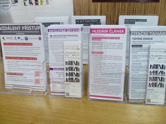 Studenti oceňují i vytváření tzv. informačních letáčků, ve kterých se jim snažíme co nejjasněji popsat jednotlivé služby poskytované naší knihovnou. Dosud vytvořené letáčky se týkají témat jako je obecné seznámení s knihovnou určené zejména pro nové studenty (Infoleták), dále Jak vypracovat rešerši, Jak vyhledat článek, Jak najít bakalářskou a diplomovou práci absolventů Ostravské univerzity, Jak vyhledávat v EDS a nebo například Návod na vyhledávání a stahování ebooks. Tím nejvíce žádaným je pak letáček s názvem Citační tahák, ve kterém jsme se pokusili studentům nastínit principy citací nejrůznějších zdrojů na základě platné citační normy. Letáčky jsou k dispozici v tištěné podobě ve všech studovnách nebo ke stažení na webových stránkách.