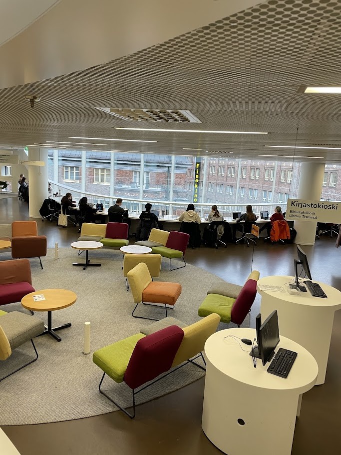 Kromě toho jsme si všimly několika společných znaků všech navštívených knihoven. Registrace je pro Finy zcela zdarma a uživatelé mohou využívat širokou škálu služeb bez omezení. Většina knihoven sídlí v nových nebo zrekonstruovaných budovách, které často získaly ocenění za architekturu. Prostor je řešen variabilně, s různými typy studijních míst, což umožňuje jak soustředěnou práci, tak neformální setkávání. Automatizace a technologie RFID výrazně zjednodušují proces půjčování a vracení knih. V maximální možné míře fungují služby v režimu „self-service“, kdy si uživatelé sami spravují své výpůjčky a využívají digitální nástroje k orientaci v knihovním fondu.