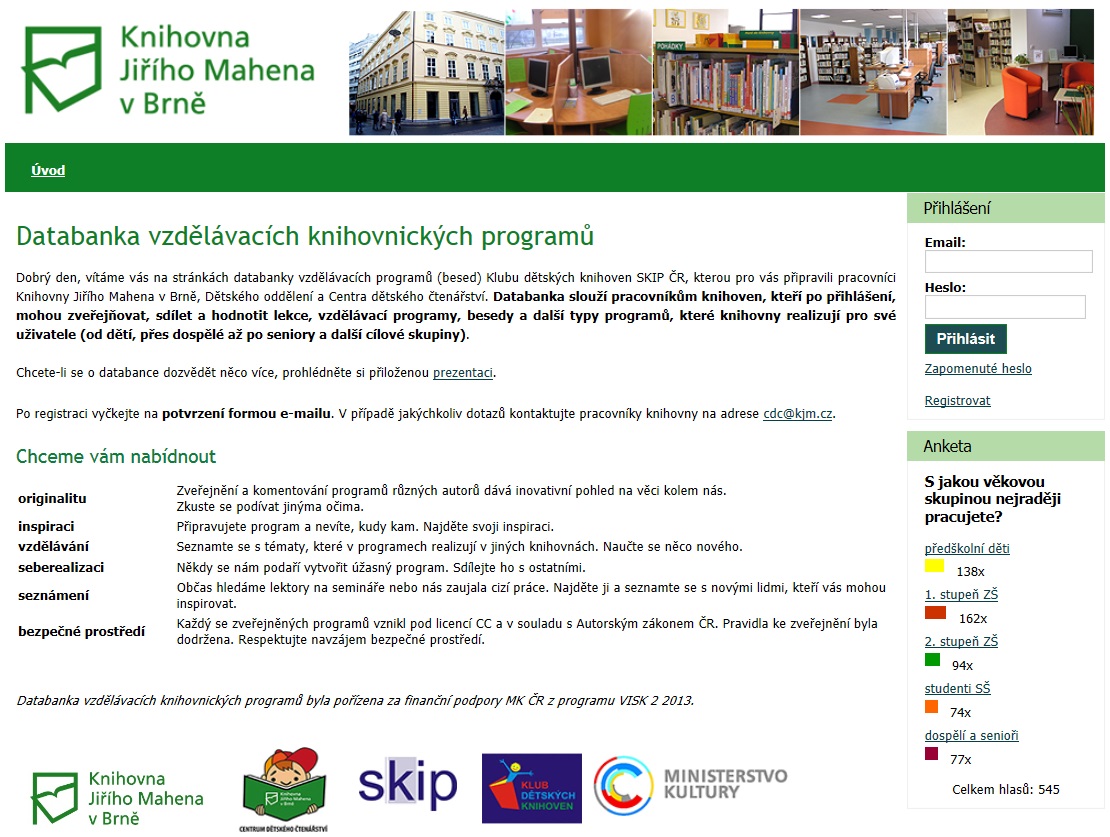 spuštěna Databanka vzdělávacích programů SKIP ČR Klubu dětských knihoven, která vznikla na základě projektu podaného na Ministerstvo kultury ČR v rámci dotačního programu VISK 2 Mimoškolní vzdělávání knihovníků. Databanku spravuje Centrum dětského čtenářství při Knihovně Jiřího Mahena v Brně. Cílem je nejen usnadnit knihovníkům práci, dát jim prostor k prezentaci vlastní práce a seznámení se s dalšími lidmi a jejich prací, ale zároveň je i vzdělávat, a to především v oblasti využívání informačních a komunikačních technologií, ale i na poli právní způsobilosti. Databanka je určena pro knihovníky, kteří ji mohou využívat po registraci na webové stránce www.knihovnici.kjm.cz. I když je v názvu uvedeno, že se jedná o databanku Klubu dětských knihoven, tak není určena jen pro „děckaře“, ale pro všechny knihovníky, a je tedy snahou, aby se v databance objevovaly i programy určené pro další skupiny – dospělé, seniory, handicapované, příslušníky menšin, prostě pro všechny uživatele knihoven. Každý uživatel databanky může vkládat své programy, stahovat programy ostatních, hodnotit pomocí hvězdiček, psát komentáře.