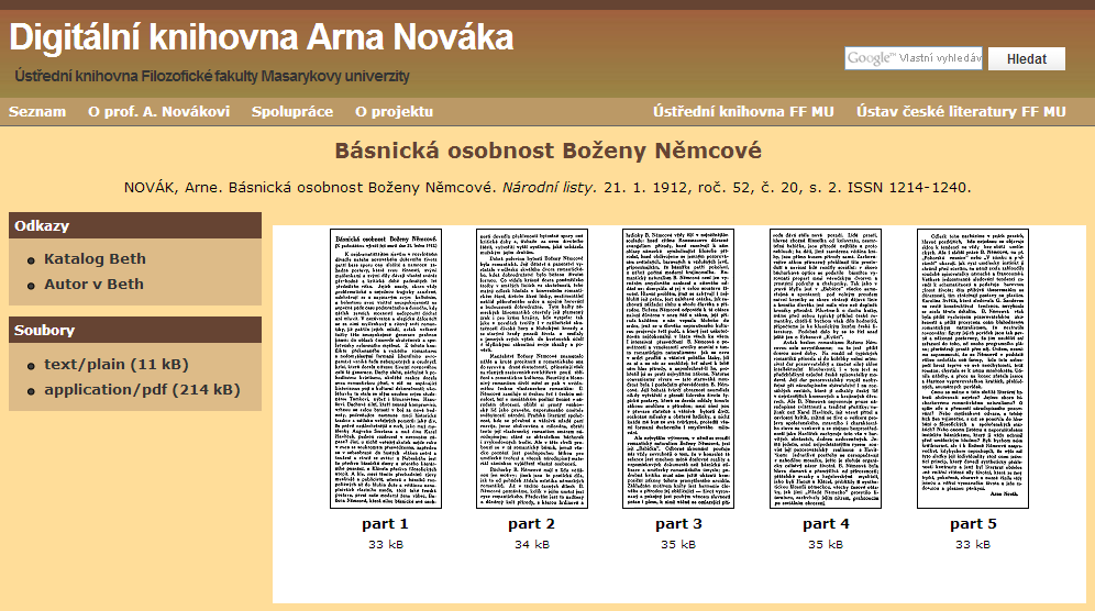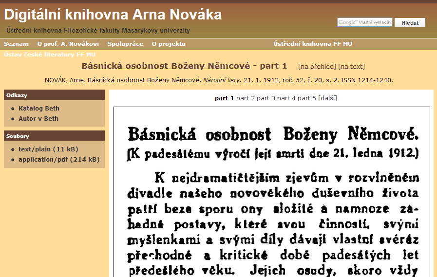 Digitální knihovna Arna Nováka: Technické řešení [online]. c2010 ÚK FF MU [cit. 2012-11-10]. Dostupné z: <http://knihovna.phil.muni.cz/arne-novak/technicke-reseni>.